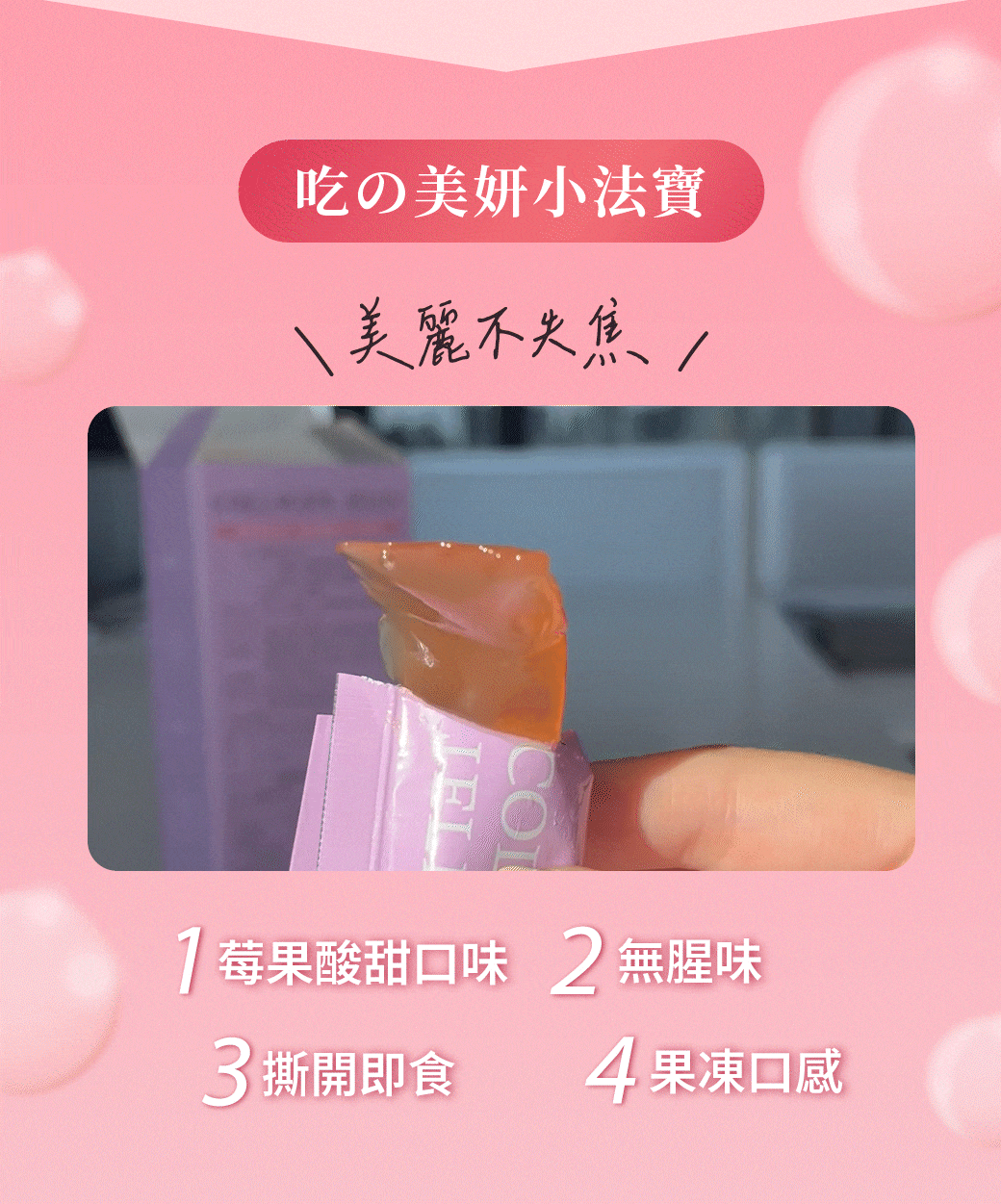 |絕佳口感:凍狀,含莓果汁,口味酸甜、無腥味